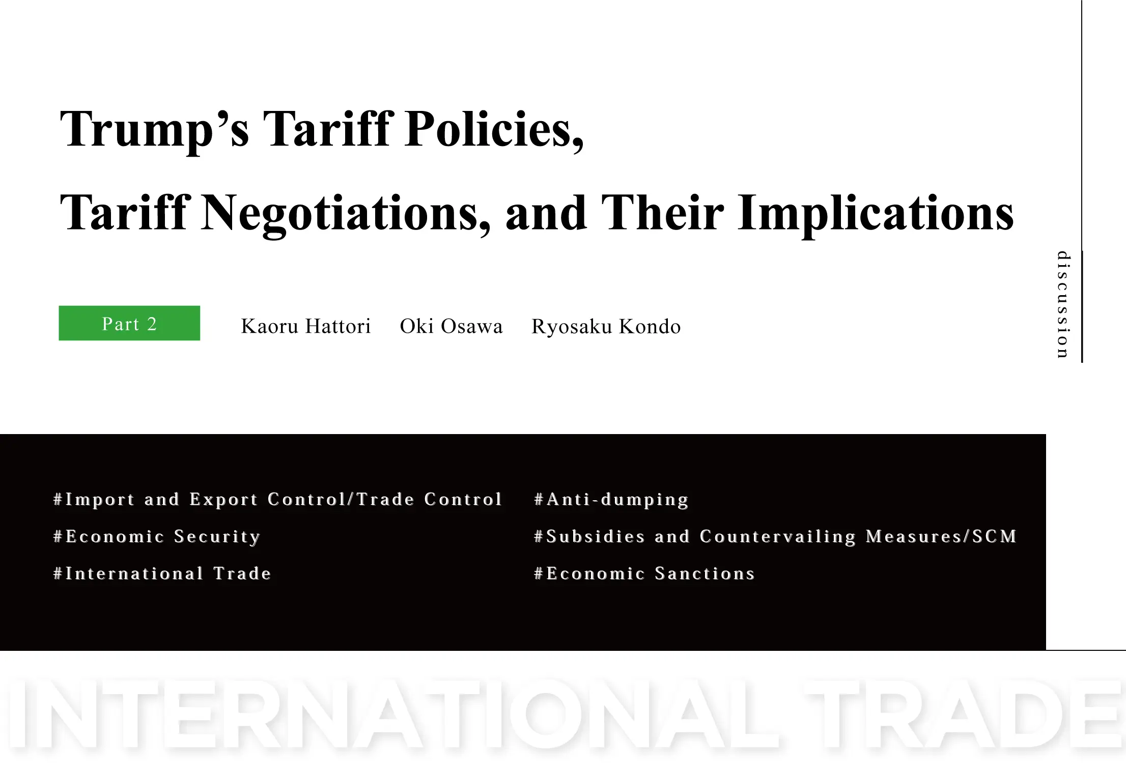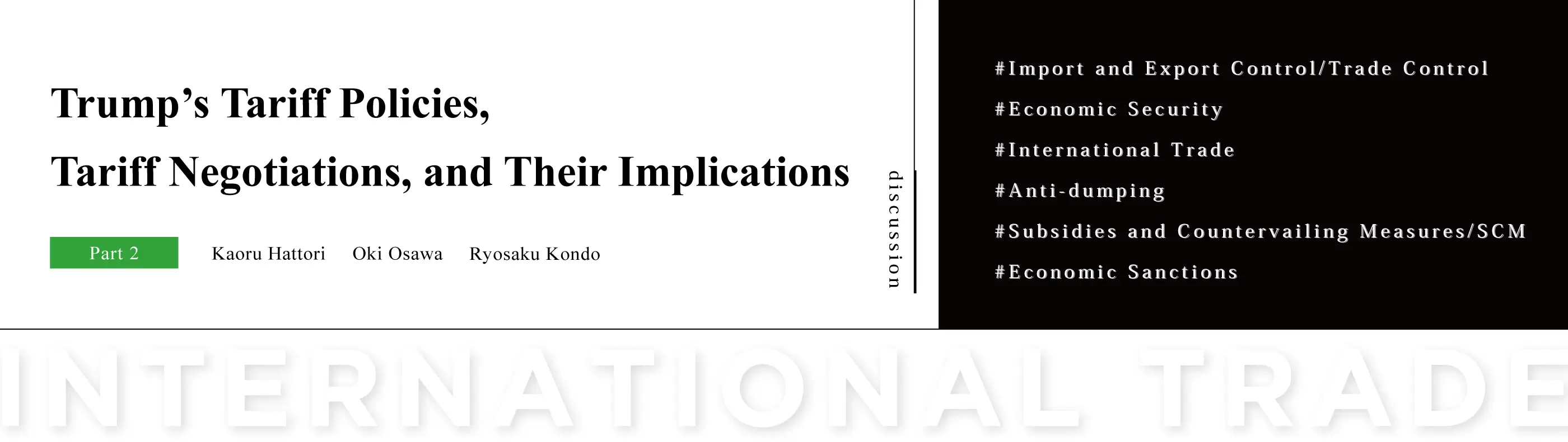 President Trump, who refers to himself as “Tariff Man,” announced a substantial increase in tariffs on imports from all countries immediately following his presidential re-inauguration in January 2025. He further declared the introduction of “reciprocal” tariffs targeting countries with large trade deficits with the United States, sending shock waves through the global economy. Following these announcements, a series of tariff negotiations ensued between various countries, and Japan was no exception. Minister Ryosei Akazawa made multiple trips to the U.S. for discussions with U.S. officials, and in July 2025, it was announced that an agreement on tariff measures had been reached between Japan and the U.S. The tariff policies of the second Trump administration have had a significant impact on Japanese companies. However, they were difficult to anticipate and were subject to revision depending on changing circumstances, even after they were announced. This left many Japanese companies struggling with how to respond. In this roundtable discussion, attorneys-at-law and trade and customs experts Kaoru Hattori, and Ryosaku Kondo, and Oki Osawa, an attorney-at-law with expertise in corporate matters from a national and economic security perspective, will examine the tariff policies of the Trump administration and the course of these negotiations. They will also share their insights on what Japanese companies should take away from them.