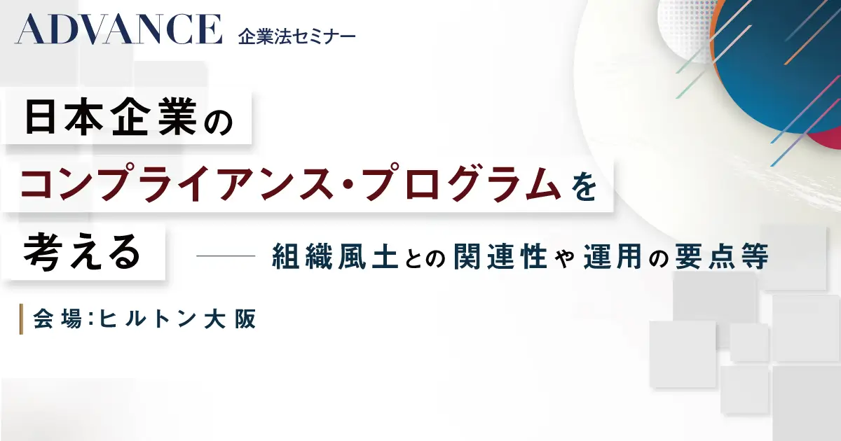 July 19, 2024 (Fri) 14:00 - 18:00Osaka Seminar: Compliance Programs in Japanese Companies – Integration with Organizational Culture, Operational Best Practices, and Key Considerations