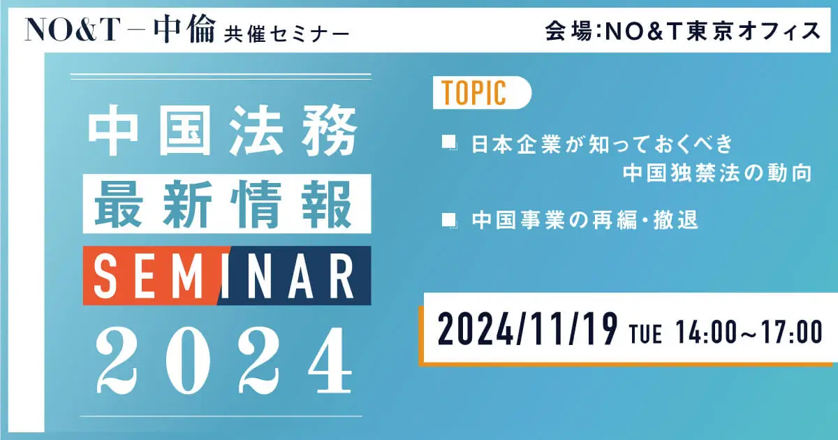 November 19, 2024 (Tue) 14:00 - 17:00Legal Updates on Chinese Legal Practice Seminar 2024 Autumn