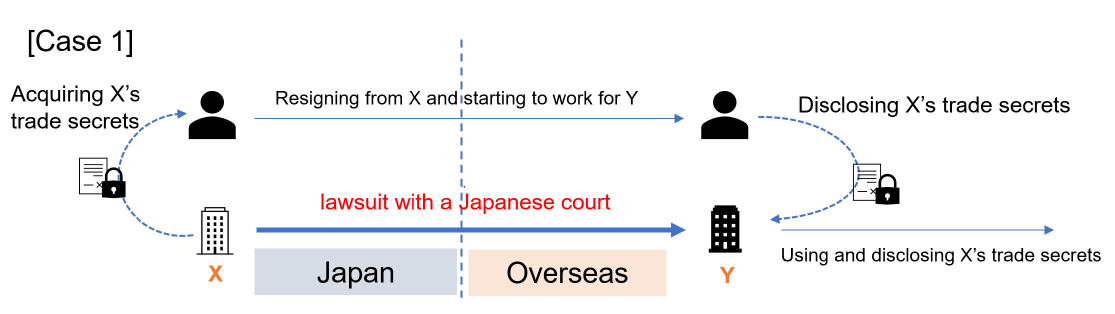 (x) Case 1: A former employee of Company X, which operates its business in Japan, resigns from Company X and begins to work for Company Y which is located outside Japan. Thereafter, such former employee of Company X discloses trade secrets relating to Company X’s business in Japan which such employee acquired while working for Company X or after resigning from Company X, to Company Y. Company Y acquires Company X’s trade secrets from said former employee of Company X, and uses and discloses the trade secrets outside Japan without obtaining an authorization from Company X. Company X becomes aware of this matter and commences a lawsuit against Company Y in a Japanese court seeking an injunction and compensation for its damages.
