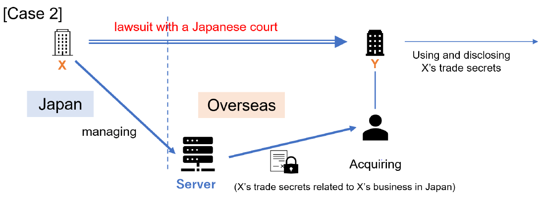 (y) Case 2: Company X stores and manages its trade secrets which relate to Company X’s business operated in Japan in a server located outside Japan. Company Y, which operates a business outside Japan, acquires the Company X’s trade secrets and uses and discloses such trade secrets outside Japan without obtaining an authorization from Company X. Company X becomes aware of this matter and commences a lawsuit against Company Y in a Japanese court seeking an injunction and compensation for its damages.