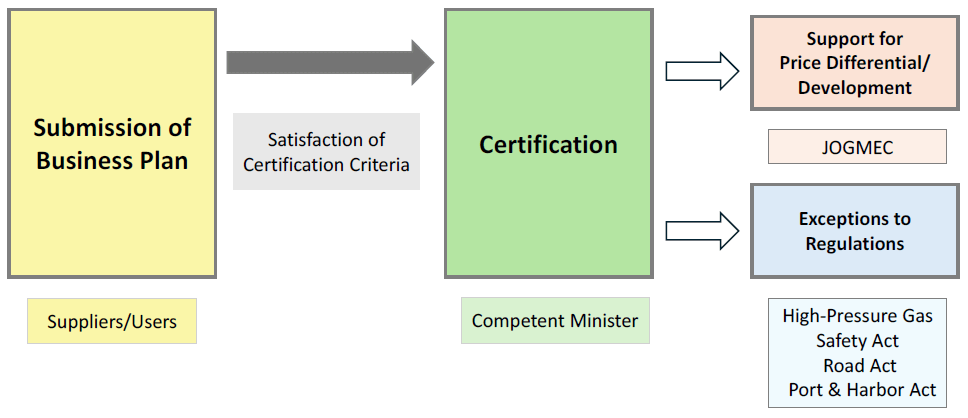 Business operators importing or supplying Low-Carbon Hydrogen domestically (the “Supplier(s)”), as well as those utilizing Low-Carbon Hydrogen (the “Users”) may independently or jointly prepare and submit a “Business Plan for Low-Carbon Hydrogen Supply, etc.” (the “Business Plan”) to the competent ministry. Upon receiving certification from the minister, these operators become eligible for subsidies for price differential support and infrastructure development support. Additionally, they may receive special exemptions concerning the High-Pressure Gas Safety Act, the Port and Harbor Act, and road occupancy regulations.