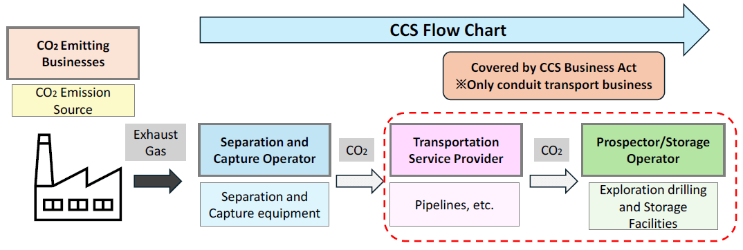 The new CCS Business Act does not serve as a comprehensive business law for the entire CCS value chain but primarily focuses on (i) the establishment of a permit system for exploration drilling and storage activities, together with regulation and safety measures concerning storage activities (Chapter 2) and (ii) regulation and safety measures for pipeline transportation activities (Chapter 3)※4. The full enforcement of the CCS Business Act will occur within two years from the date of its promulgation, as stipulated by Cabinet Order. However, regulations related to prospecting will be enforced within six months from the date of its promulgation, and other provisions will be gradually enforced (Article 1 of the Supplementary Provisions). As of now, no details of any ordinance related to the CCS Business Act have been disclosed.