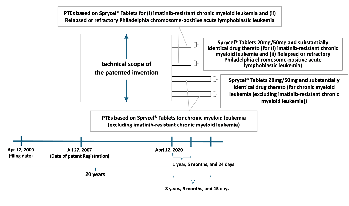 PTEs for the Patent were granted for a period of 1 year, 5 months, and 24 days based on the marketing authorizations for “Sprycel® Tablets 20mg” and “Sprycel® Tablets 50mg” (collectively, “Sprycel® Tablets”), respectively. The generic name of Sprycel® Tablets is dasatinib hydrate.