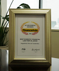 The FinanceAsia Japan Achievement Awards 2008 was held at the Foreign Correspondents’ Club of Japan, and Nagashima Ohno & Tsunematsu ("NO&T") was awarded the Best Domestic Financial Law Firm for two consecutive years.