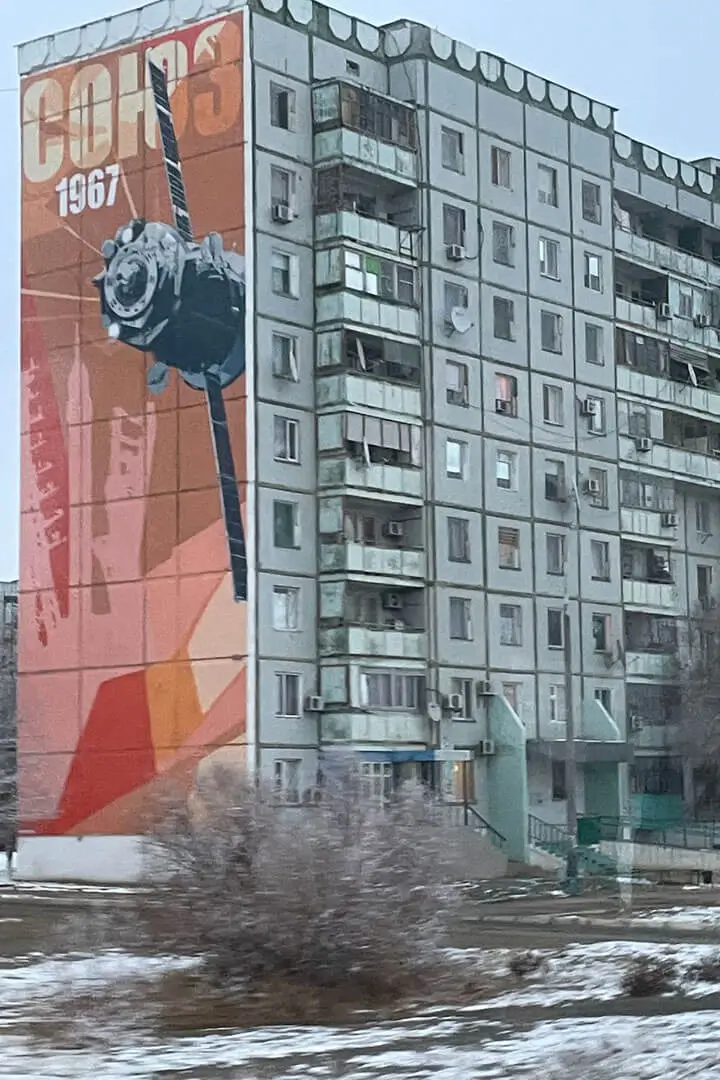 翌7日の午前4時にモスクワを出発して今度はドモジェドヴォ空港という別の空港に向かう。まだ夜明け前で真っ暗な中、バスで雪道を約1時間走った。バイコヌール行きの便は、大吹雪で1時間半遅れの出発となったが、なんとか出発し、バイコヌールの空港でカザフスタンに入国する。そこから、大分寂れた雰囲気でありながらも、そこかしこに宇宙関係のモニュメントや壁画アートが見られるバイコヌールの市内を抜けて、スプートニクホテルというホテルにチェックインし、その後直ぐに発射場(launch pad)の見学に向かった。