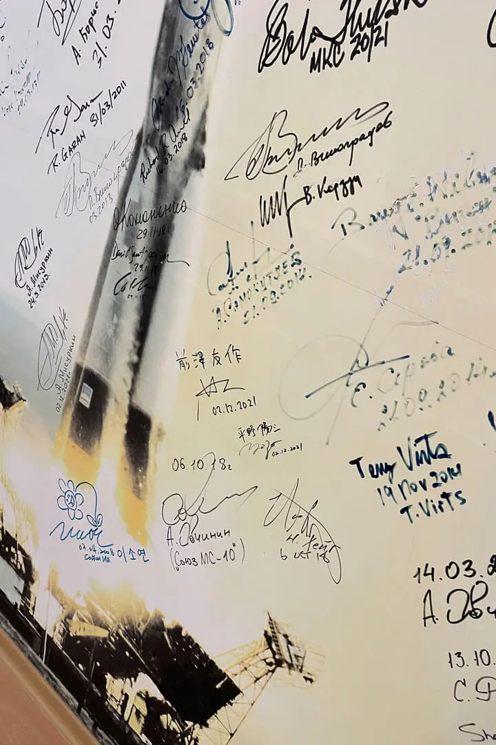 その後、船長を含む宇宙飛行士3名が、建物の外に出てきて、発射場行きのバスに乗り込むのだが、その前に、外で、ロシア宇宙当局の高官に出発の報告をするという短いセレモニーが行われる。再びバスに乗った宇宙飛行士に手を振って見送ると、我々は、バイコヌール宇宙基地内にある建物でランチの後、宇宙博物館に案内された。この宇宙博物館の庭園には、色々なロケットの実物が展示されており、その中には、数年前まで砂漠に放置されていたというブラン(ロシア版スペースシャトル)の実機もあった。ミュージアムの中では、ロシア(ソビエト連邦を含む。以下同様。)の宇宙開発の歴史が多くの模型とともに詳細に説明されており、ロシアが初めて犬やうさぎを宇宙に送ったときの宇宙船の模型なども置かれている。また、ロシアから宇宙に飛び立った宇宙飛行士がサインするボードが設置されているのだが、前澤氏のサインも既に加わっていて、感無量であった。