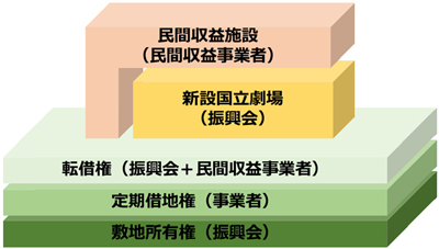 かかる複合施設の権利関係を反映して、その敷地の権利関係は若干複雑なものとなっている。すなわち、国立劇場の敷地を所有する振興会は、その敷地について事業者に対して70年間の定期借地権(但し、既存施設の解体及び新規国立劇場の建設期間中は使用貸借)を設定し、定期借地権の設定を受けた事業者は、新設国立劇場の所有者となる振興会と民間収益施設の所有者となる民間収益事業者に対して、転借地権を設定し、振興会と民間収益事業者が転借地権を準共有するものとされている。