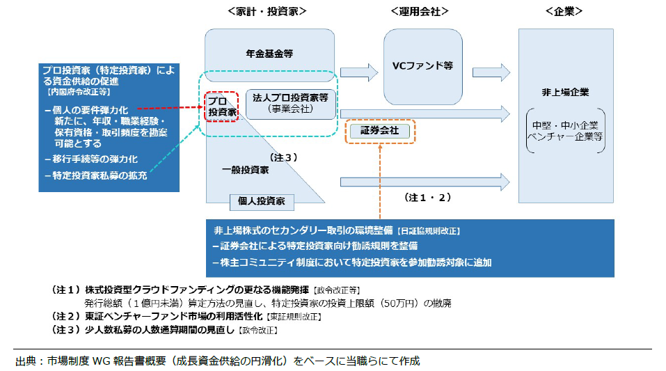 非上場企業の成長のための資本性資金を供給する主体として、投資者の裾野を広げ、非上場企業に成長資金を流入しやすくする制度に発展させることができるかがポイントになっています。これを踏まえ、2021年6月に公表された金融審議会市場制度ワーキング・グループ第二次報告書では、以下の見直しが提言されました※12。