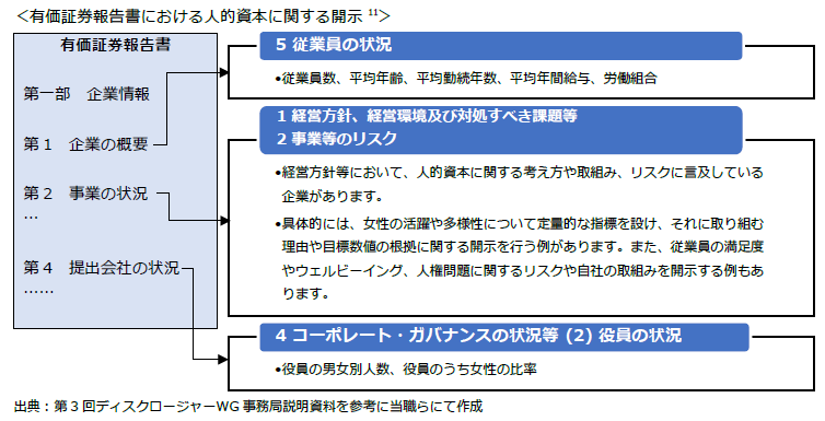 ディスクロージャーWGでは、人的資本を含むサステナビリティに関する情報開示について、投資判断に必要な情報を提供する観点から、核となる情報を有価証券報告書に記載することができるよう、サステナビリティ情報の記載欄を設けることについての議論がなされています。