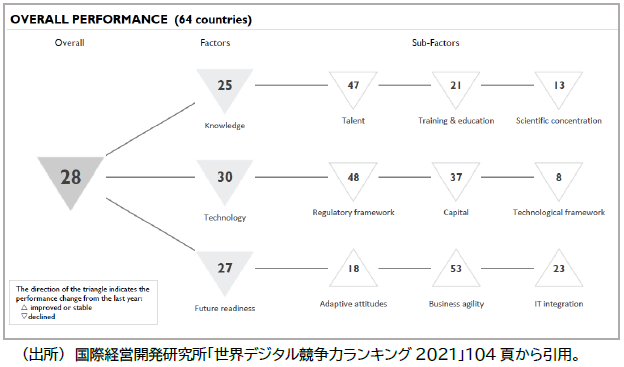 国際経営開発研究所(International Institute for Management Development)の世界競争力センター(World Competitiveness Center)の公表した世界デジタル競争力ランキング(2021)によれば、日本は64か国中28位に位置づけられ、昨年よりさらに順位を一つ下げています。