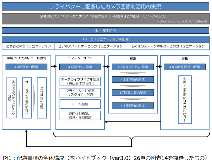 第1に、「4.2 コミュニケーションの配慮」においては、「4.2.1 生活者とのコミュニケーション」では生活者に対し説明責任等を果たすための具体的な方策が、「4.2.2 ビジネスパートナーとのコミュニケーション」では情報共有やカメラ画像の利活用に係る管理の徹底が、「4.2.3 その他のステークホルダーとのコミュニケーション」では関係行政機関・業界団体との相談や情報交換、(被撮影者となる場合の)従業員に対する説明が、それぞれ配慮事項として挙げられています。第2に、「4.3 企画時の配慮」においては、設計前及びその後の恒常的なリスク分析の実施、サービス目的の明確化が配慮事項として挙げられています。第3に、「4.4 設計時の配慮」においては、データのライフサイクル及び責任主体の確定、リスクの分析及び特定、当該リスクに対応可能な情報システムの設計・運用ルールの策定及びプライバシーに配慮した運用並びに関係者への周知徹底が配慮事項として挙げられています。最後に、「4.9 継続利用時の配慮」においては、必要に応じた各種ルールの見直しやリスク評価の実施が配慮事項として挙げられています。