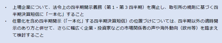 以上の議論を踏まえ、今回のDWGでは、以下の四半期開示制度の見直し方針が示されました。