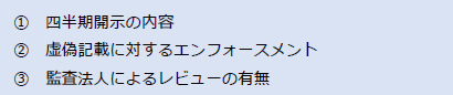 具体的な制度設計は、四半期開示の適時性と正確性を両立させるという観点を踏まえて、本年夏以降にDWGで議論される予定です。その際の主な検討ポイントとして、以下が指摘されています。
