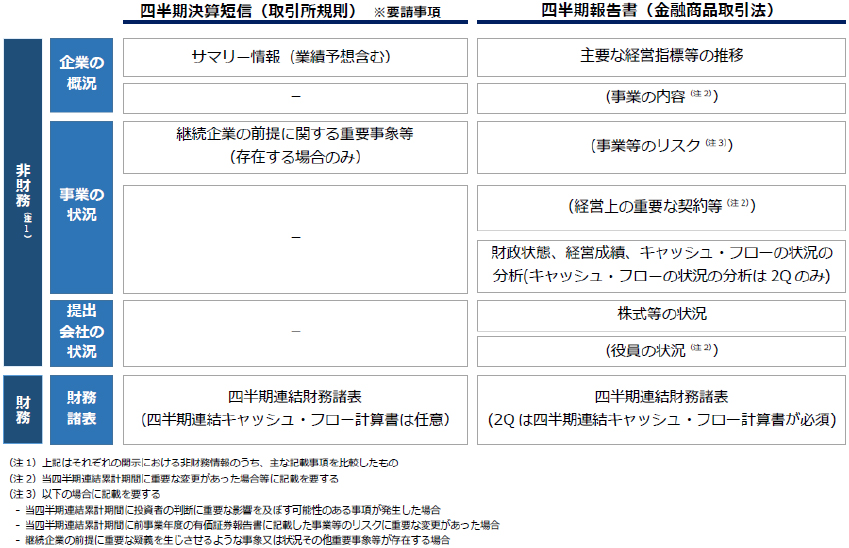 現在の四半期決算短信の内容は、これまでの開示の自由度向上や速報性への特化に向けた取組みの結果、開示が要請される事項として、サマリー情報(業績予想を含む)、継続企業の前提に関する重要事象等(存在する場合)、四半期連結財務諸表が掲げられるに留まるなど、比較的簡易なものとなっています。一方、四半期報告書には、四半期連結財務諸表が掲載されるとともに、財政状態、経営成績、キャッシュ・フローの状況の分析が記載されるほか、事業の内容、事業等のリスク、経営上の重要な契約等および役員の状況に関する当該四半期連結累計期間に生じた重要な変更なども記載されます(詳細は、下記【参考】をご参照ください。)。