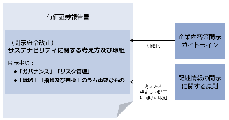 本改正案では、有価証券報告書の「経営方針、経営環境及び対処すべき課題等」欄と「事業等のリスク」欄の間に、新たに「サステナビリティに関する考え方及び取組」欄を設けることとされています。