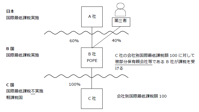 トップ・ダウン・アプローチの重要な例外として、「被部分保有親会社等」(POPE: Partially-Owned Parent Entity)がある場合、最終親会社ではなく、被部分保有親会社等において課税を受ける(大綱127頁「3(2)」)。「被部分保有親会社等」とは、特定多国籍企業グループ等に属する中間親会社で、グループ外の者の所有持分の割合が20%を超えるものをいう。最終親会社(下図のA社)による中間親会社(下図のB社)に対する支配が80%未満である場合、その中間親会社の少数株主(20%超)の持分に関してミニマム課税が行われない可能性があるため、できるだけミニマム課税を捕捉するため、1階層下がって被部分保有親会社等(下図のB社)のレベルで所得合算ルールが適用されるのである(モデル規則2.1.4条、コメンタリー第2章パラ21)。