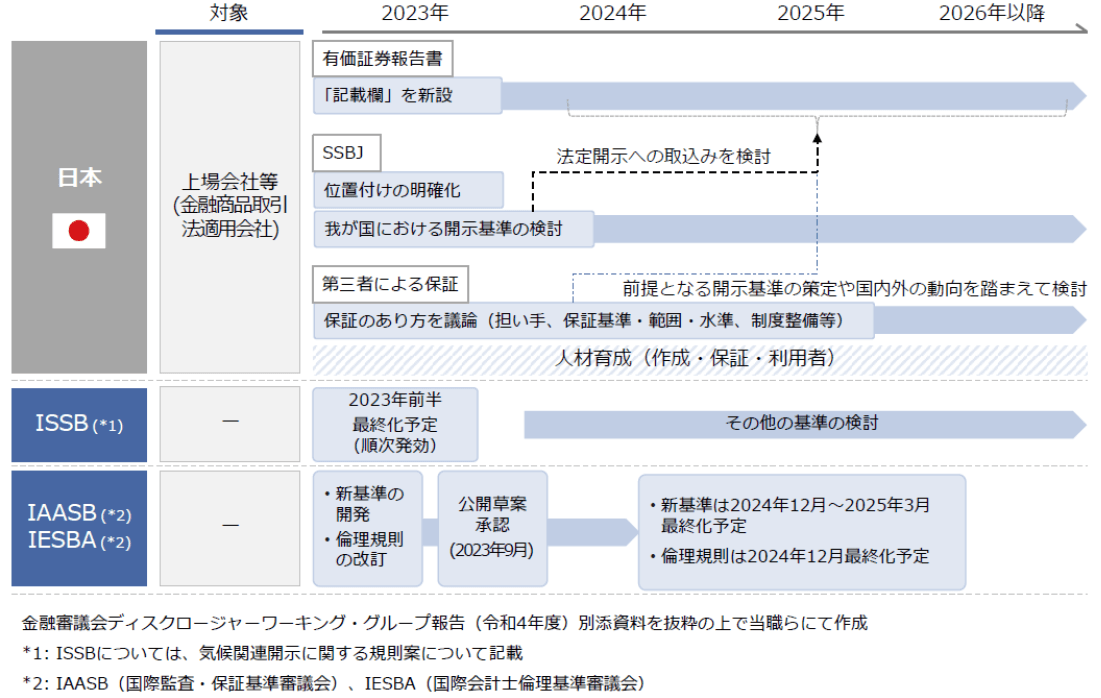 2023年3月期の有価証券報告書等から、上記のサステナビリティ開示が求められることになりますので、各企業の皆様は開示に向けた準備を進める必要があります。また、有価証券報告書等におけるサステナビリティに関する開示基準は、上記の改正だけで完了するものではありません。12月DWG報告では、ISSBにおける開示基準の開発の方向性を見据えながら国内の開示基準の開発に向けた議論を進めていくことが重要であると提言されています。そして、ISSBの開示基準は2023年前半の最終化が目指されており、その動向に注意が必要です。