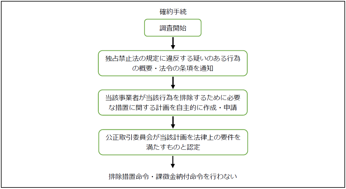 確約手続とは、2016年の法改正によって独占禁止法において導入されている手続であり、概要以下のような手続をとれば、計画や社名は公表されるものの、排除措置命令および課徴金納付命令は行われなくなるというものです※1。