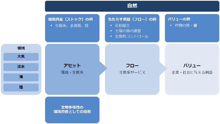 TNFDは、環境資産のうち、生態系に関するものを生態系資産(ecosystem assets)と位置づけ、生態系資産が人々や経済に利益をもたらすことを生態系サービス(ecosystem services)と捉えています。そして、生物多様性(biodiversity)は、生態系資産の質、レジリエンス及び量を維持し、企業や社会が依存する生態系サービスにとって不可欠なものであると位置づけられています。