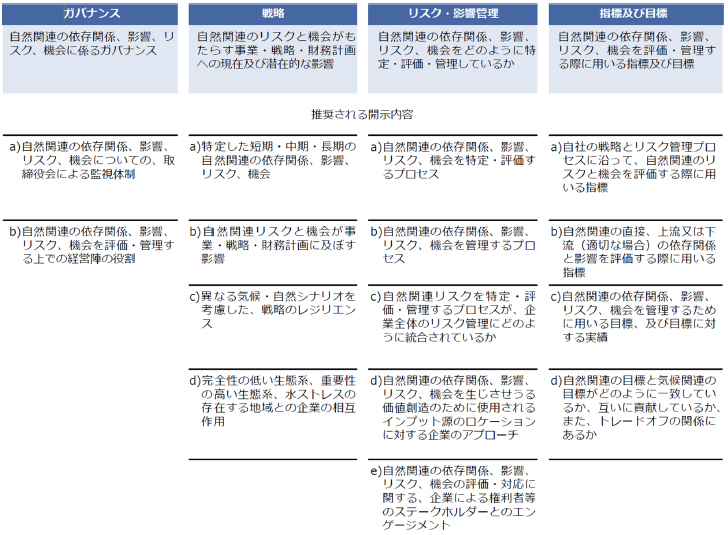 以上の自然資本・生物多様性についての基本的な理解を前提として、TNFDでは、推奨される開示の中核的な要素として、TCFDと同様に、「ガバナンス」、「戦略」、「リスク管理」及び「指標及び目標」の4つが掲げられています。これは、TCFDの開示項目を参考にしつつも、固有のものも相応に含まれています。
