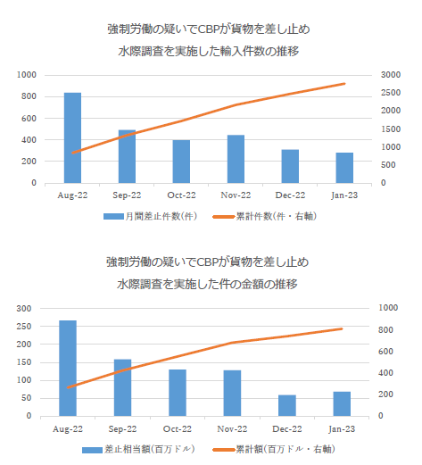 また、CBPが公表している月例の執行状況報告※6によれば、2022年8月以降、UFLPA又はWROに服するものも含め、強制労働利用の疑いによりCBPが水際調査を行った輸入件数・金額の傾向は以下のグラフのようになる。これによれば、UFLPA施行開始直後の2022年8月はまだ該当件数・金額ともに非常に高い数字であり、また、どの月も数百件以上の強制労働疑いの事例が一定数発生し、累計数は増加していると言える一方で、各月ごとの件数・金額は全体として減少傾向にある。これは、UFLPAの施行から時間が経つにつれ、いわゆるハイリスクセクターに属する製品の米国への輸出件数が減っていった傾向を示すものとみられる。