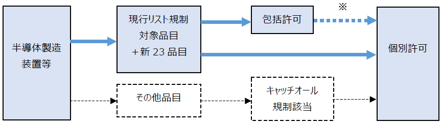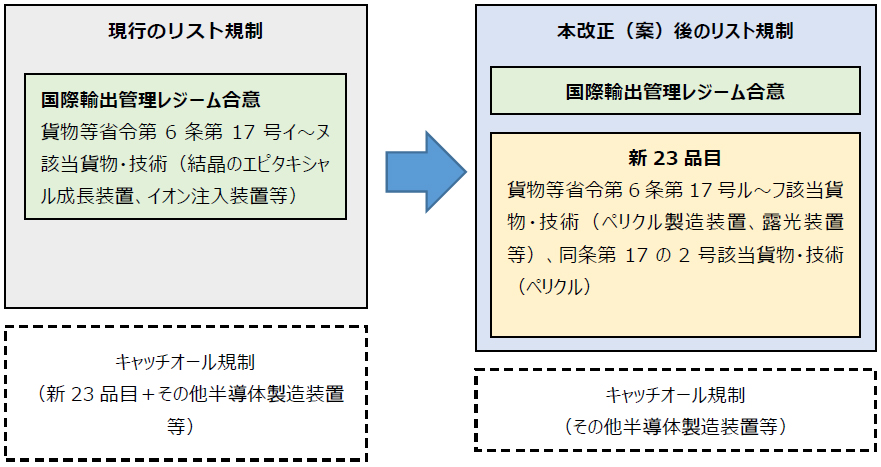 本改正案は、これまでリスト規制の対象とされていなかった高性能な半導体製造装置やその部品・付属品(具体的には、半導体の製造に必要な洗浄・成膜・露光検査等の各工程の先端品向け装置23品目)を新たにリスト規制品に追加するものです(品目の詳細は別紙(※)をご参照ください。以下、本改正案により新たにリスト規制品に追加される23品目を「新23品目」といいます。)。((※)別紙はPDF内に掲載しておりますので、「全文ダウンロード(PDF)」よりご覧ください。)