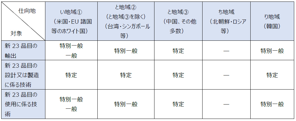 本改正案が施行された場合、新23品目の輸出や、当該品目(貨物)の設計・製造・使用に係る技術の提供(以下「輸出等」といいます。)について、包括許可又は個別許可が必要になります(輸出令第1条及び別表第一の7の項、外為令第17条及び別表の7の項)。一般包括許可や特別一般包括許可が利用できる場面は、現在、「い地域①」(米国、EU諸国等)、「と地域②」(「と地域③」を除く。台湾、シンガポール等)及び「り地域」(韓国)を仕向地とする輸出等に限られており、中国を含めたそれ以外の国・地域への輸出等を行う場合には、特定包括許可(継続的な取引関係を行っている同一の相手方に対する輸出が対象)の範囲に含まれるときを除き、個別に輸出許可申請・役務取引許可申請を行う必要があります。