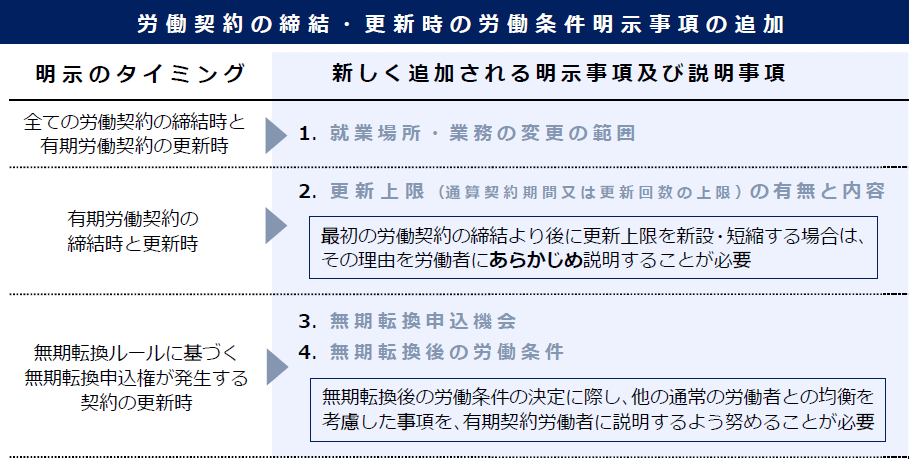 就業場所・業務の変更の範囲の明示は、新規に労働契約を締結する場合は勿論、有期労働契約を更新する場合にも、更新のタイミングごとに明示することが求められます。