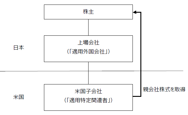 上記1.のとおり、自己株式取得税は原則として米国国内の上場会社に対してのみ適用されることが想定されていますが、一定の場合には外国の上場会社にも適用があります。そのうち、特に問題となるのは、その株式が外国の確立した証券市場で取引されている外国会社(applicable foreign corporation、「適用外国会社」)の特定関連者のうち、米国内会社、米国内パートナーシップ又は米国内エンティティが直接又は間接のパートナーとなっている外国パートナーシップである者(以下、かかる特定関連者を「適用特定関連者」といいます。)が、適用外国会社の株式を取得する場合にも自己株式取得税の適用があるとされている点です※6。したがって、日本の上場企業が米国子会社をして、当該上場会社の株式を取得させた場合にも、自己株式取得税が課せられることとなります(図1参照)。
