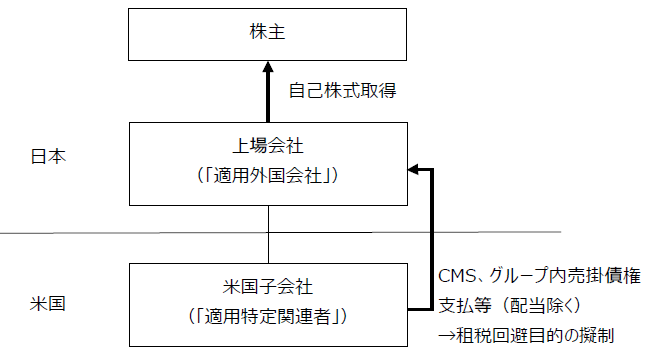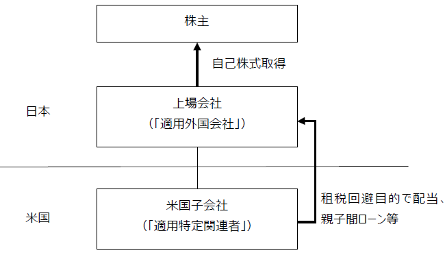 これによると、たとえば、日本の上場企業(適用外国会社)が、余剰資金を有する米国子会社(適用特定関連者)によって上場企業の株式を取得させる場合には自己株式取得税が発生することから、当該課税を避けるために、米国子会社から配当、貸付等によって取得資金を調達した上で、自ら自己株式取得を行った場合にも、自己株式取得税を適用される可能性があります(図2参照)。
