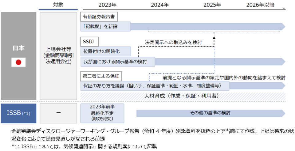 2022年12月に、金融庁の金融審議会ディスクロージャーワーキング・グループ(令和4年度)から日本におけるサステナビリティ開示のロードマップが公表されました。このロードマップによると、以下のとおり、SSBJの開発する基準が将来的に有価証券報告書等の開示事項に取り込まれることが想定されていますので、上場会社においては、その源となるISSBのS1基準およびS2基準の内容について、現段階からその内容を理解して強制開示に備えておくことが有益と思われます。