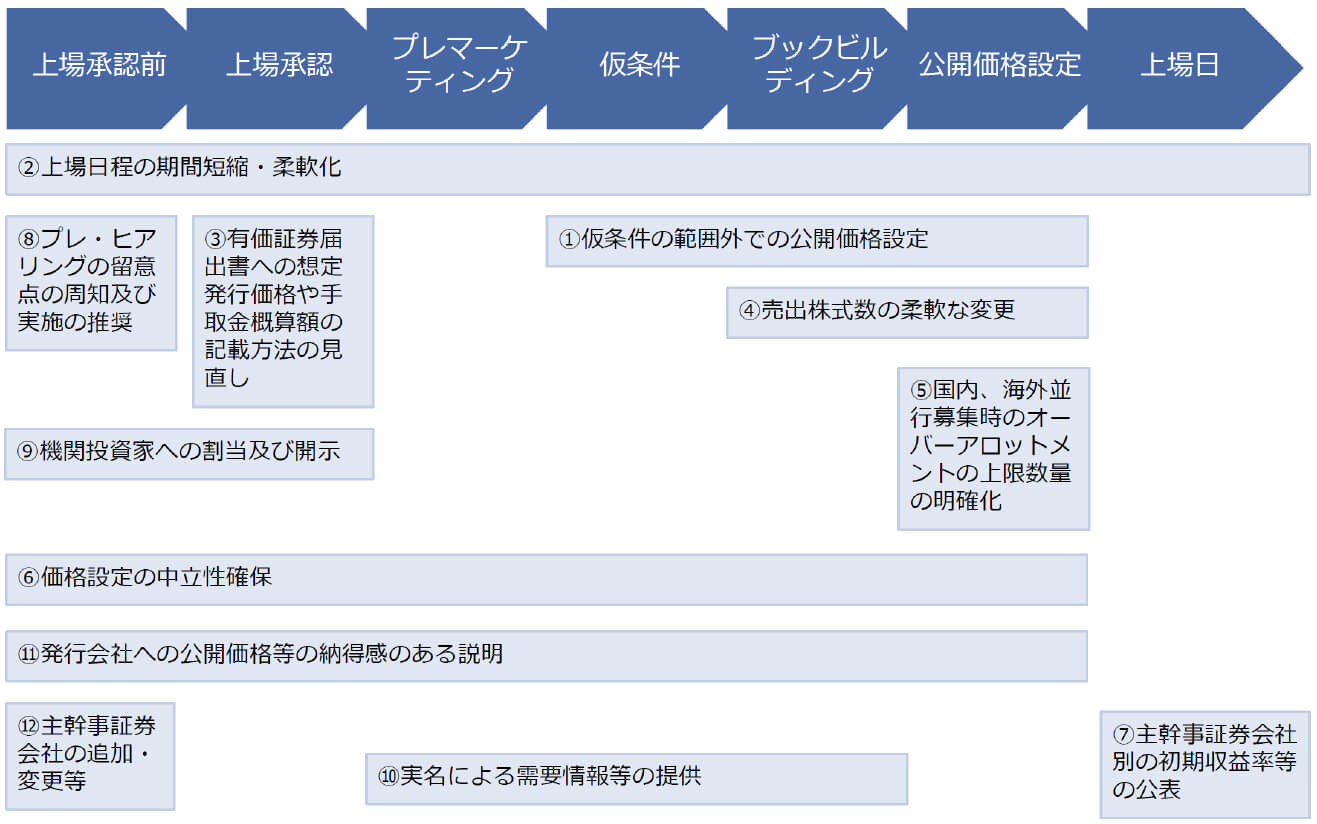 そこで、日証協WG報告書では、有価証券届出書を上場承認日よりも前に提出する可能性も含め、上場承認日から上場日までの期間、仮条件決定日から上場日までの期間、公開価格設定日から上場日までの期間のそれぞれを短縮する改善案や、上場日の設定を柔軟化する改善案が示されました。