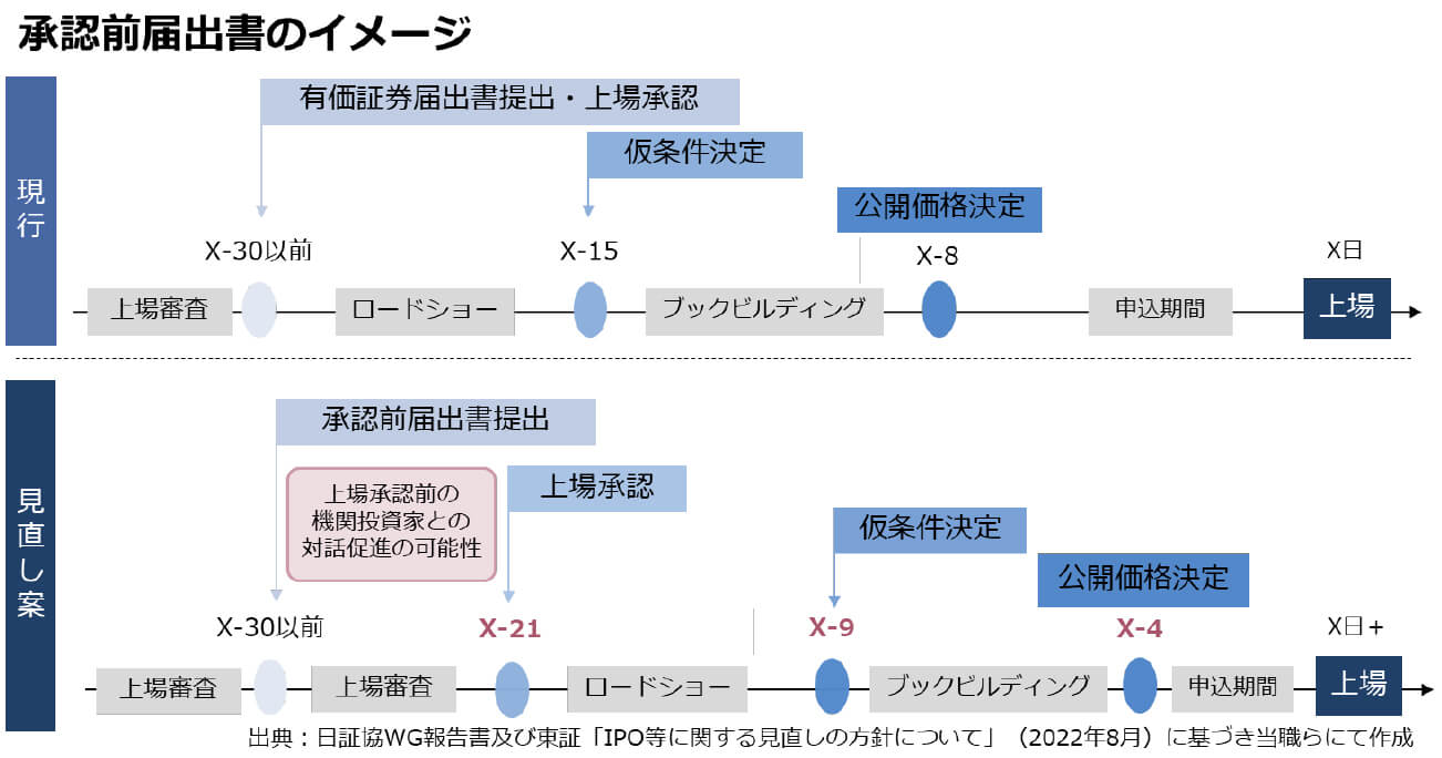 また、従前の日本のIPO実務では、上場承認前における機関投資家に対する接触は、いわゆる届出前勧誘規制に違反しない範囲で行われていたところ、本改正案の施行後は、上場承認日より前に承認前届出書を提出することにより、届出前勧誘規制との関係では上場承認前に「勧誘」に該当する行為を実施することが可能となる結果、機関投資家との十分な対話を踏まえた上での適切な公開価格の設定が可能となることが期待されます。