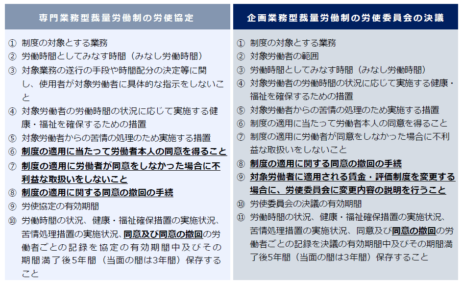①の事項及び③のうち同意に関する記録の保存については、企画業務型裁量労働制においては、現行法においても、労使委員会決議事項とされていますが(労基法38条の4第1項6号)、本改正により、専門業務型裁量労働制においても、制度の適用に際し労働者本人の同意を得ることが必要とされました。