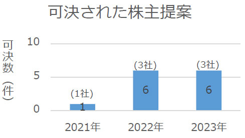 株主提案の数は、過去3年間の6月総会のデータ(下図)※3によると、本年度も増加傾向にあり、また、株主提案が他の株主の賛成票を集めて可決される事例は、6件(3社)と、一昨年から昨年度に増加した件数を維持しました。