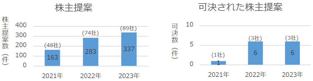 本年度における新たな傾向としては、可決された株主提案議案の内容に変化が生じている点が挙げられます。すなわち、2021年及び2022年の6月総会において可決された株主提案議案は、役員の選任議案のみであったのに対して、2023年6月総会においては、役員の選任議案に加えて剰余金配当に関する議案も可決される例が現れました。また、2022年及び2023年において可決された議案を提案した株主の属性には、必ずしもアクティビストには該当しない投資ファンドも見受けられたことも、新たな傾向といえます。