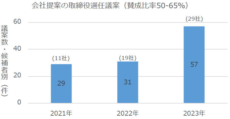 さらに、本年6月総会においては、国内外のアクティビストにより取締役選任議案の反対キャンペーンが行われた事例が複数件生じました。反対理由として掲げられた事由は多岐にわたっており、議決権行使助言会社においても是々非々で賛成・反対の判断を行っていることが窺われますが、このように、アクティビストの活動が議決権行使助言会社や機関投資家を巻き込む形で一般株主の投票行動に大きな影響を与え得ることに留意する必要があります。