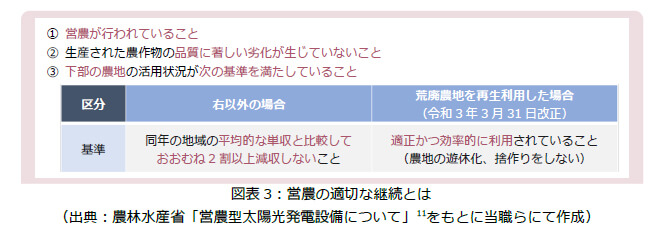 ①営農の適切な継続が確保されていること、②荒廃農地を再生利用する場合以外の場合は、下部の農地での単収が同じ年の地域の同じ農作物の平均的な単収と比較しておおむね2割以上減収していないこと、③荒廃農地を再生利用する場合は、下部の農地の全部又は一部が農地法第32条第1項各号のいずれにも該当していないこと、④生産された農作物の品質に著しい劣化が認められないことが要件とされています(農林水産省「営農型発電設備の実務用Q&A(営農型発電設備の設置者向け)」問15(令和3年7月))(https://www.maff.go.jp/j/nousin/noukei/totiriyo/attach/pdf/einogata-45.pdf)。