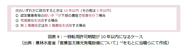 営農型太陽光発電と異なり、農地を非農地に転用した上で太陽光発電設備を設置して売電を行う事業で必要となる転用許可については、当該太陽光発電事業を行う期間に特段制限は設けられません。一方で、一時転用許可の期間は原則3年以内であり(平成30年通知別表(4))、例外的に、下記図表4の①~③のいずれかを満たす場合には10年以内となります(平成30年通知別表(1)乃至(3))。そして、当初取得する一時転用許可期間の経過後も営農型太陽光発電を継続する場合には、一時転用許可の再許可の取得が必要となります。