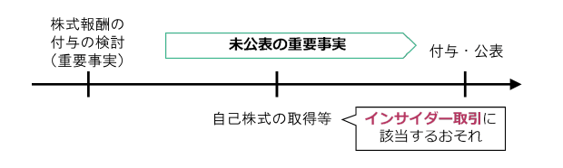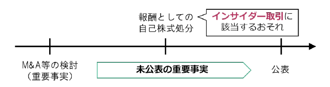 上場会社等が付与対象者に対し自己株式の処分による有償での株式の交付を行う場合※7、インサイダー取引規制上の「売買等」に該当すると解されている。このため、発行会社が、株式報酬として自己株式処分の方法により株式を交付する時点で未公表の重要事実を保有している場合には、少なくとも理論上は、別途適用除外取引に該当しない限り、当該株式報酬の付与(株式の交付)自体が、インサイダー取引規制違反になる可能性がある。