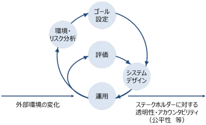 AIガバナンスにおいては、①「環境・リスク分析」、②「ゴール設定」、③「システムデザイン」、④「運用」、⑤「評価」(及び⑥「環境・リスク分析の再分析」)といったサイクルを、マルチステークホルダーで継続的かつ高速に回転させていく、「アジャイル・ガバナンス」の実践が重要とされており、これを図示したのが以下の図1です。