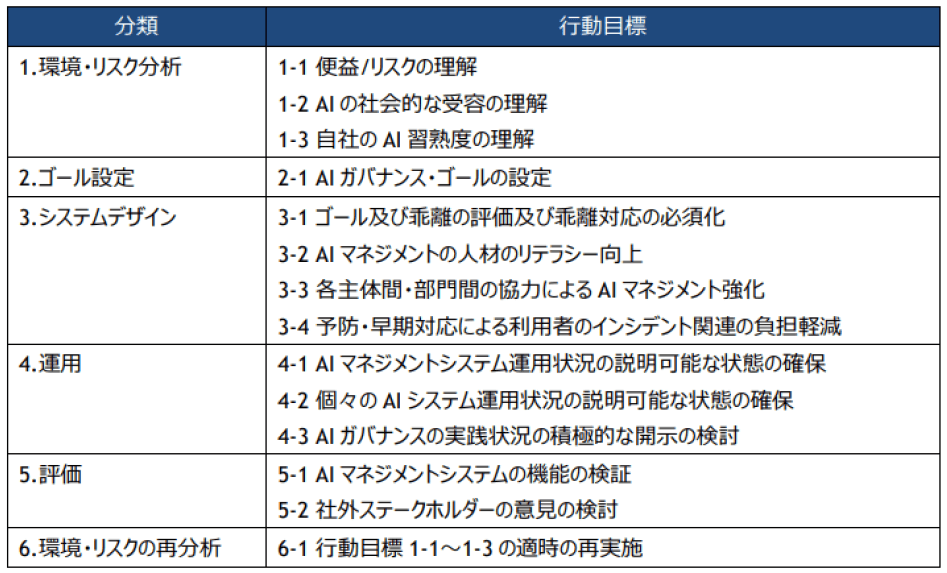 さらに、別添では上記①~⑥の構築ステップ毎に行動目標が設定されており、これらを表にしたものが下記の表2です。これらの行動目標にはそれぞれ「実践のポイント」及び「実践例」が示されており、具体的にどのような取組みをすればよいのか分かるようになっています。例えば、「2-1 AIガバナンス・ゴール」の設定に関しては、「共通の指針」への対応事項等を示す自社の取組方針(「AIポリシー」、「データ活用ポリシー」等)を設定することが考えられます。