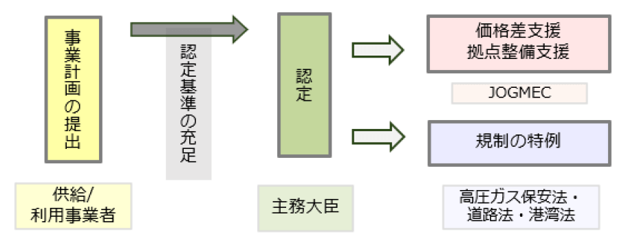 水素社会推進法の中核となるのが、計画認定制度と認定事業者に対する支援措置(価格差支援及び拠点整備支援)及び規制の特例措置の導入である。