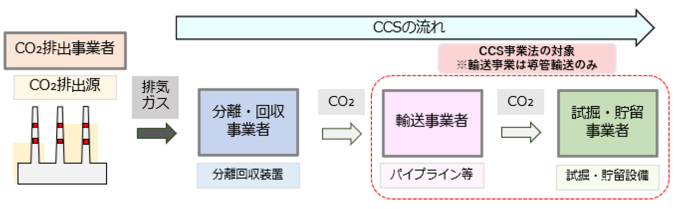 現行の海洋汚染等及び海上災害の防止に関する法律(以下「海洋汚染防止法」という。)は、何人も、原則として、油、有害液体物質等または廃棄物の海底下廃棄(物を海底の下に廃棄すること(貯蔵することを含む。)をいう。)をしてはならないと定める一方(同法第18条の7)、環境大臣の許可を得た場合に限り、「特定二酸化炭素ガス」を海底下廃棄することを認めている(同条第2号)。CCS事業法の制定により、今後、海洋汚染防止法における特定二酸化炭素ガスの海底下廃棄許可制度(現行海洋汚染防止法第18条の8参照)は廃止され(CCS事業法附則第14条)、CCS事業法に一本化されることになる(改正後海洋汚染防止法第18条の7第2号参照)。