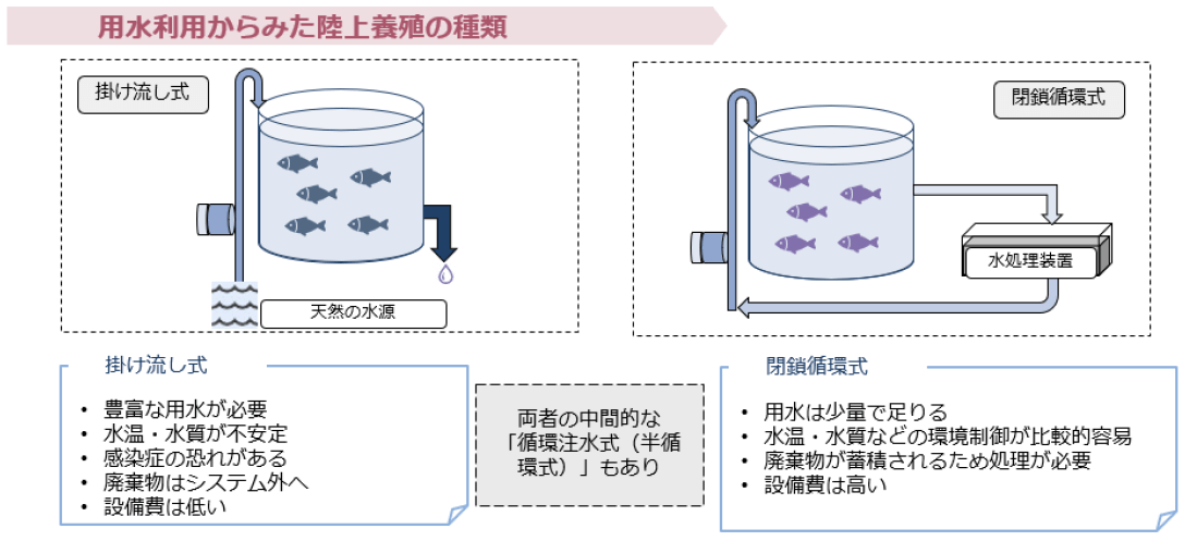 掛け流し式は、海水、淡水などの天然の水源から継続的に用水を飼育層に引き込み、飼育水として使用する方式です。これに対し、閉鎖循環式は、濾過システムなどの水処理装置を活用し汚れた飼育水を入れ替えることなく水処理を行うことで長期間連続的に循環利用する方式です。二つの方式の中間的な形態として、循環注水式(半循環式)があります。掛け流し式の場合、豊富な用水が必要であることや養殖場の設置場所に制約が大きいこと、天然の水源を利用するために水温・水質が不安定で感染症の懸念が相対的に高いなどのデメリットがあるとされます。他方で、システムは閉鎖循環式よりも簡素化されるため、施設整備のコストを低く抑えることが可能というメリットがあります。これに対して、閉鎖循環式の場合、施設整備のコストが高くなるという短所があるものの、水温や水質といった環境制御が比較的容易であったり、少ない用水で足りるといった利点もあります。