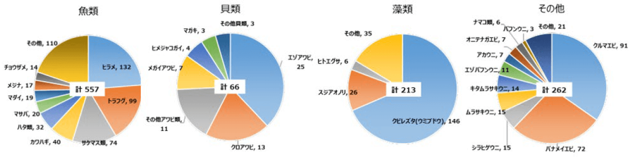 水産庁によれば、令和6年1月1日時点において、陸上養殖業の届出件数(古くから河川、川沿い等で営まれている陸上養殖及び指定養殖業に該当するものを除きます。)は、662件に上ったとされます※6。届出のあった養殖種類の内訳は、以下の通りとされています。