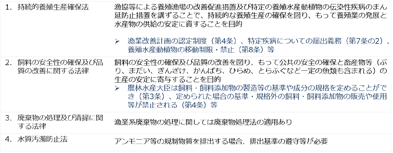 陸上での養殖に限られたものではありませんが、養殖の実施に際しては以下の法令にも留意する必要があります。