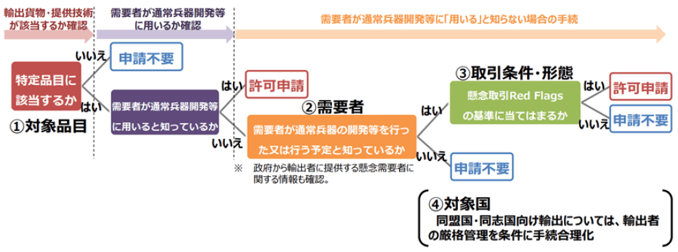 現行の外国為替及び外国貿易法(以下「外為法」という。)に基づく通常兵器キャッチオール規制は、いわゆるリスト規制品目(軍事転用の可能性が特に高い機微な貨物・技術として輸出貿易管理令別表第1の1~15項において指定された貨物及び外国為替令別表の1~15項において指定された技術)以外の全ての品目(食料や木材等は除く。)を対象としているが、国連武器禁輸国以外の国・地域(以下「一般国」という。)を仕向地とする場合、経済産業大臣から輸出許可申請をすべき旨の通知を受けた場合(インフォーム要件)に限って規制対象とされており、輸出者による用途確認・需要者確認の結果、通常兵器の開発・製造・使用に用いられるおそれがある場合に輸出許可申請を必要とする要件(いわゆる客観要件)は定められていない。