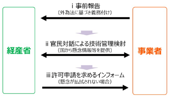 本中間報告においては、事前報告を求める時期について、技術提供取引に係る契約が行われる前の報告を義務づけるべきとしており、その背景には、上記(ii)官民対話の結果として技術提供者が任意に技術提供を中止・変更する可能性も想定し、このような場合に技術提供者が相手方に対する債務不履行責任等を負わないようにするという配慮があると思われる。もっとも、技術提供者は技術提供に関する具体的な協議等を契約締結前に相手方と行っていると考えられ、相手方との協議状況等によっては、官民対話を通じて経済産業省から懸念を示された旨を説明するだけでは技術提供の中止・変更に関する相手方の理解を得ることが困難な場合も想定され、場合によっては紛争化する可能性もあり得る。そこで、官民対話においても、経済産業省が技術提供者に技術流出懸念を示して技術提供の中止・変更の検討を要請するような場合には、(事柄の性質上、技術提供にかかる懸念の理由をそのまま伝達することは難しかったとしても)技術提供者が相手方の理解を得る上でのサポートを可能な範囲で行ったり、技術提供者が相手方の理解を得られないときにはインフォームによる許可申請の義務づけ等を行ったりするなどして、技術提供者が経済産業省から示された技術流出懸念と相手方への対応の間で板挟みにならないよう配慮した実務運用となることが望まれる。